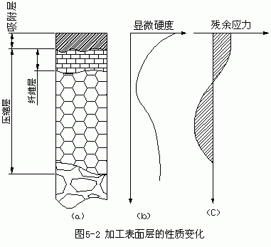 表面層的物理力學性能包括表面層的加工硬化、殘余應力和表面層的金相組織變化。機械零件在加工中由于受切削力和熱的綜合作用,表面層金屬的物理力學性能相對于基本金屬的物理力學性能發(fā)生了變化。圖 5— 2a所示為零件表面層沿深度方向的變化。最外層生成有氧化膜或其他化合物,并吸收、滲進氣體粒子,稱為吸附層。吸附層下是壓縮層,它是由于切削力的作用造成的塑性變形區(qū),其上部是由于刀具的擠壓摩擦而產(chǎn)生的纖維層。切削熱的作用也會使工件表面層材料產(chǎn)生相變及晶粒大小變化。
