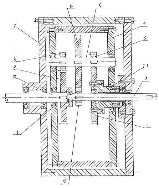 | 一種外齒式差動(dòng)減速機(jī),包括大箱體(7)、軸承(11)、支承在大箱體(7)上的輸入軸(2)和輸出軸(10),其特征在于: a、輸入軸(2)上固定連接有主動(dòng)齒輪(12); b、輸出軸(10)的內(nèi)端固定有輸出齒輪(9); c、大箱體(7)內(nèi)具有可旋轉(zhuǎn)地支承在大箱體(7)和輸出軸(10)上的行星齒輪架(4),大箱體(7)內(nèi)還有與大箱體(7)固定連接的速比定齒輪(1); d、行星齒輪架(4)上支承有行星齒輪軸(5),該行星齒輪軸(5)上固定連接有與主動(dòng)齒輪(12)嚙合的傳動(dòng)齒輪(6)、與速比定齒輪(1)嚙合的第一行星齒輪(3)和與輸出齒輪(9)嚙合的第二行星齒輪(8)。 |
