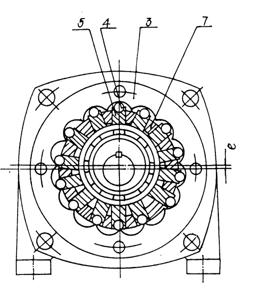 | 一種適用于機械傳動裝置的內(nèi)齒減速機,包括由輸入軸(1)聯(lián)接的偏心機構(gòu)及驅(qū)動圈(7),固齒圈(3)等部分組成,其特征在于沿驅(qū)動圈(7)外圓徑向開設(shè)有等分導(dǎo)槽,并與驅(qū)動圈(7)的內(nèi)環(huán)槽相通,在每個等分導(dǎo)槽的兩邊裝有擋塊(6),使之形成四周封閉的槽孔,在槽孔內(nèi)裝有滑桿(5),滑桿(5)的一端呈R形面,并裝有滾動體(4)在槽孔中作徑向滑動,同時滾動體(4)與固齒圈(3)嚙合,滑桿(5)的另一端呈平面或弧面,接觸于偏心機構(gòu)中的雙偏心凸輪(2)的軸承外圈上,在雙偏心凸輪(2)上裝有與滑桿(5)嚙合的滾動軸承(10)。 |