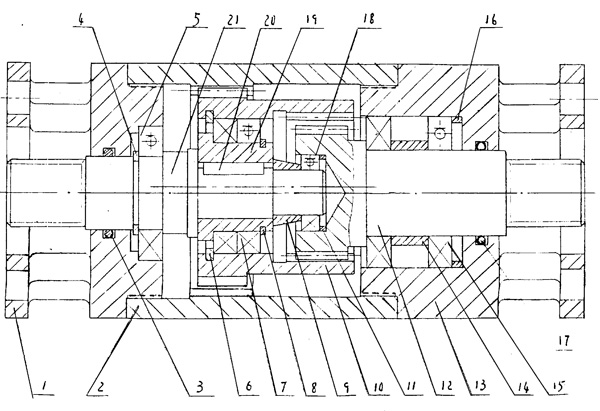 | 一種潛油減速機(jī),由左端蓋、內(nèi)齒輪、O形圈、擋圈、軸承、定距套、雙聯(lián)齒輪、調(diào)整環(huán)、齒輪軸、右端蓋、偏心套、鍵、軸組成,其特征是:左端蓋內(nèi)裝O形圈,在軸上安裝軸承并用擋圈固定,將軸裝在左端蓋上,把鍵裝在軸右端,并將偏心套裝在軸上,在雙聯(lián)齒輪上安裝擋圈及軸承,并一起裝在偏心套上,用擋圈固定,定距套裝在軸的右端,內(nèi)齒輪與左端蓋靠螺紋連為一體,右端蓋內(nèi)裝O形圈,并安裝調(diào)整環(huán)、軸承、定距套,在齒輪軸左端裝調(diào)整環(huán)和軸承,并一起裝入右端蓋內(nèi),連同整體靠螺紋與內(nèi)齒輪連為一體。左端蓋與電動(dòng)機(jī)把合,右端蓋與油泵把合。 |