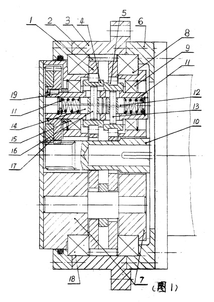 | 一種屬于曲柄擺線減速機(jī)或擺線減速機(jī)結(jié)構(gòu)形式的工業(yè)機(jī)器人微回差減速機(jī),其特征在于: (a)輸入軸[19]內(nèi)有一通孔; (b)輸入軸[19]裝配偏心軸承[4]、[5]部位上分別加工出同旋向的二螺旋槽,每一處螺旋槽系旋轉(zhuǎn)180°對稱、同旋向二短槽,兩槽旋轉(zhuǎn)貫通,槽指向偏心軸承內(nèi)孔鍵槽; (c)輸入軸[19]內(nèi)孔有對應(yīng)于螺旋槽的二只拉桿[14]與[12],在桿的徑向分別裝配銷[16]與[13],銷的一端置于一側(cè)螺旋槽中,另一端伸出另一側(cè)螺旋槽而與偏心軸承內(nèi)孔鍵槽滑配,當(dāng)拉桿移動時,拉桿隨其上的銷沿螺旋槽移動的同時并轉(zhuǎn)動,最終使二偏心軸承相對偏轉(zhuǎn)一小角; (d)拉桿[14]、[12]兩端分別有壓縮彈簧[11],彈簧初壓縮力使二偏心軸承相對偏轉(zhuǎn)一小角度而不再錯開180°。 |