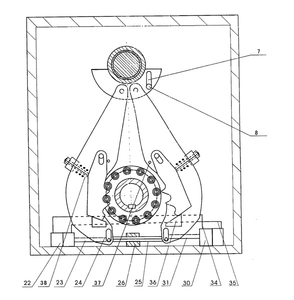 | 一種減速機(jī),其特征是輸入軸是偏心軸(2),偏心軸(2)中間偏心外圓上設(shè)置3-12個(gè)外套(32),每個(gè)外套(32)上分別連接連桿(27)位于殼體(1)內(nèi)一側(cè),每個(gè)連桿(27)連接能與滾輪(13)邊緣上的滾子輪(10)嚙合的鉤齒板(16);在工作時(shí)至少有1個(gè)鉤齒板(16)和對應(yīng)滾輪(13)邊緣上的滾子輪(10)嚙合,每個(gè)滾輪(13)邊緣上裝有5-80個(gè)滾子輪(10),上述所述的連桿(27)上裝有與滾輪(13)邊緣上的滾子輪(10)嚙合的鉤齒板(16)與對應(yīng)的3-12個(gè)滾輪(13)分別固定在輸出軸(12)上,且兩個(gè)相鄰滾輪邊緣上的滾子輪(10)在橫向排列上相位差是一個(gè)等值弧度,在連桿(27)上設(shè)置有定位槽(24),固定銷(21)設(shè)置在連桿(27)定位槽(24)內(nèi)位于殼體(1)內(nèi),鉤齒板(16)背面設(shè)置有彈性復(fù)位裝置。 |