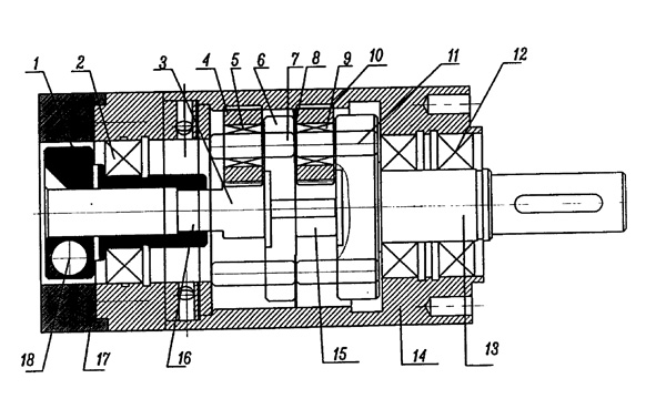 | 一種低側(cè)隙行星齒輪減速機(jī),其特征在于由下列部件組成,其位置和連接關(guān)系是: 在箱體的中心軸線上,從左至右,依次為后法蘭(17)、聯(lián)軸器(1)、一級太陽輪軸(16)、一級太陽輪(3)、中間行星架(6)、二級太陽輪(15)、輸出軸(13),并依次相互連接; 在中間行星架(6)左右兩邊分別有一級行星輪軸(7)和二級行星輪軸(11),在一級行星輪軸(7)上有一級行星輪(4),在二級行星輪軸(11)上有二級行星輪(10);一級行星輪(4)與一級太陽輪(3)嚙合,二級行星輪(10)與二級太陽輪(15)嚙合; 在后法蘭(17)上有鎖緊螺栓(18)。 |