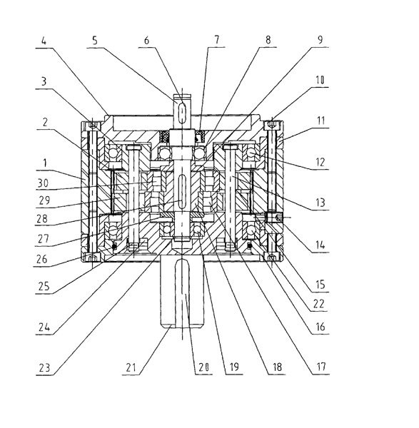 | 一種星輪減速機(jī),包括輸入軸、輸出軸、齒輪、齒圈和通蓋,其特征是:減速機(jī)殼內(nèi)裝有輸入軸、輸出軸、齒輪、齒圈,輸入軸裝有偏心套(18),輸入軸(5)有雙支撐軸承(8、19),偏心套裝有兩偏心軸承(17、30),兩偏心軸承(17、30)分別裝有齒輪(2、29),兩齒輪(2、29)外聯(lián)接齒圈(1),兩齒輪(2、29)由連接銷軸(13)固定于均載盤(3)和軸出軸(21),均載盤(3)設(shè)有軸承(12),輸出軸(21)外圓與通蓋(16)間裝有密封圈。 |