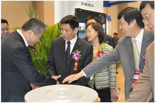 原國(guó)務(wù)院國(guó)資委監(jiān)事會(huì)主席喬龍德、中材國(guó)際工程股份有限公司副總裁方芳在展臺(tái)前