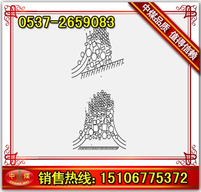 煤矸石中可燃物主要黃鐵煤和煤而氧氣及熱量積聚環(huán)境與其堆積結(jié)構(gòu)關(guān)。矸石山在自然堆放(平地或順坡堆放)過程中均會(huì)發(fā)生矸石粒度偏析在矸石山內(nèi)產(chǎn)生“煙囪效應(yīng)”(如圖所示)。氧化產(chǎn)生熱量-部分由“煙囪效應(yīng)”隨空氣帶出另一部分則積聚在矸石山中。當(dāng)某-局部溫度達(dá)到自燃點(diǎn)時(shí)便引起自燃且逐步向四周蔓延。