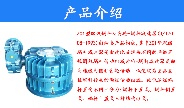 ZC1型雙級蝸桿及齒輪-蝸桿減速器(JB/T7008-1993)由兩類產(chǎn)品構(gòu)成,其中ZC1型雙級蝸桿減速器是由速比及規(guī)格不同的兩級圓弧圓柱蝸桿傳動組成齒輪-蝸桿減速器是由高速級為圓柱齒輪傳動、低速級為圓弧圓柱蝸桿傳動的兩級傳動組成。按低速級蝸桿置向不同可分為:蝸桿下置式、蝸桿側(cè)置式、蝸桿上式三種結(jié)構(gòu)形式!霎a(chǎn)品特點該系列減速機具有承載能力高、傳動效率高、傳動比大、結(jié)構(gòu)緊湊等特點,主要適用于冶金、礦山、起重、運輸、化工建筑、建材、建筑、輕工等行業(yè)。