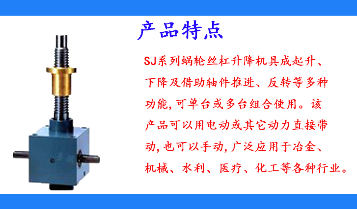 SJ系列蝸輪絲杠升降機(jī)具成起升、下降及借助軸件推進(jìn)、反轉(zhuǎn)等多種功能,可單臺或多臺組合使用。該產(chǎn)品可以用電動或其它動力直接帶動,也可以手動,廣泛應(yīng)用于冶金、機(jī)械、水利、醫(yī)療、化工等各種行業(yè)。