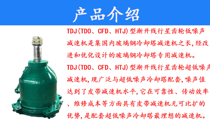 TDJ(TDO、CFD、HTJ)型倒裝式漸開線齒輪低噪聲減速機(jī),是我廠自行設(shè)計(jì)國(guó)內(nèi)獨(dú)家開發(fā)生產(chǎn)的更新?lián)Q代的冷卻塔專用減速機(jī),該減速機(jī)安裝在風(fēng)機(jī)的下面,出水管的上面,減速機(jī)、風(fēng)機(jī)等件的重量不再承受在塔體上,避免了塔體長(zhǎng)期受壓而變形塔的綜合噪聲降低。本產(chǎn)品為國(guó)家專利產(chǎn)品。