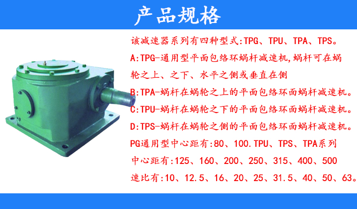 TP系列平面包絡(luò)環(huán)面蝸桿減速器(JBT9051-1999)為平面一次包絡(luò)蝸桿傳動(dòng),包括tpU、TPS、TPA三種形式,適用于冶金、礦山、起重、運(yùn)輸、建筑、石油、化工、航天、航海設(shè)備或精密傳動(dòng)的減速傳動(dòng)。