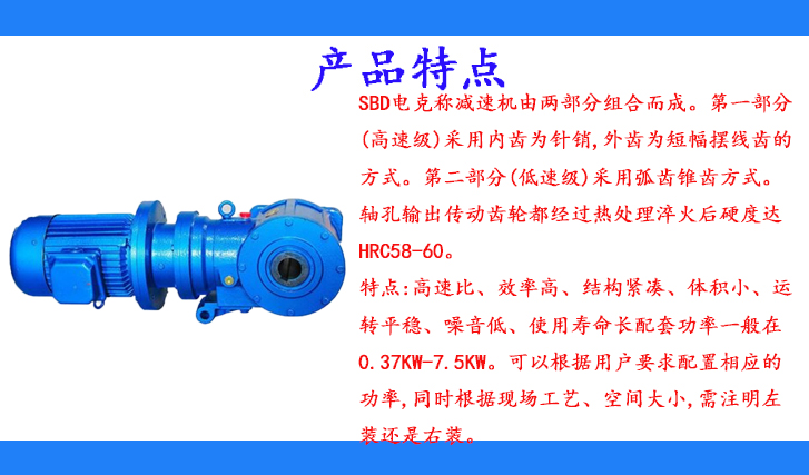 SBD電克稱減速機(jī)由兩部分組合而成。第一部分(高速級(jí))采用內(nèi)齒為針銷,外齒為短幅擺線齒的方式。第二部分(低速級(jí))采用弧齒錐齒方式。軸孔輸出傳動(dòng)齒輪都經(jīng)過熱處理淬火后硬度達(dá)HRC58-60。