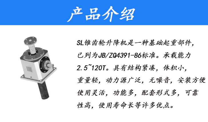 SL錐齒輪升降機(jī)是一種基礎(chǔ)起重部件,已列為JBZQ4391-86標(biāo)準(zhǔn)。承載能力2.5~120T。具有結(jié)構(gòu)緊湊、體積小、重量輕、動(dòng)力源廣泛、無噪音、安裝方便、使用靈活、功能多、配套形式多,可靠性高、使用壽命長(zhǎng)等許多優(yōu)點(diǎn)。