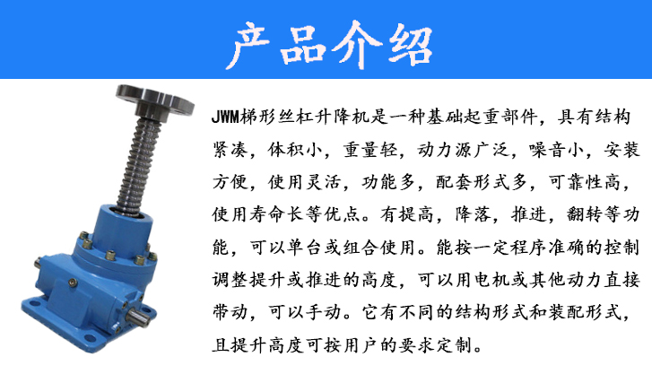 JWM梯形絲杠升降機是一種基礎起重部件,具有結(jié)構(gòu)緊湊、體積小、重量輕、動力源廣泛、無噪音、安裝方便、使用靈活、功能多、配套形式多、可靠性高、使用壽命長等許多優(yōu)點?梢詥闻_或組合使用,能按一定程序準確地控制調(diào)整提升或推進的高度,也可以用電動機或其它動力直接帶動,也可以手動。它有不同的結(jié)構(gòu)形式和裝配形式,且提升高度可按用戶的要求定制。