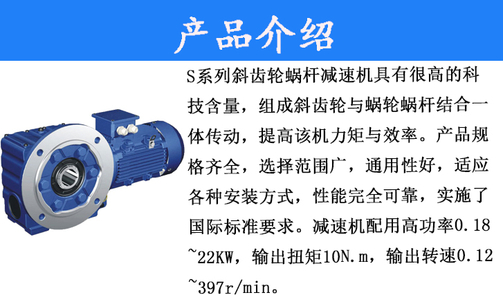 S系列齒輪蝸桿減速電機(jī)具有很高的科技含量,有斜齒輪與蝸輪蝸桿結(jié)合一體傳動(dòng),提高該機(jī)力矩與效率。該系列產(chǎn)品規(guī)格齊全,轉(zhuǎn)速范圍廣,通用性好,適應(yīng)各種安裝方式,性能安全可靠壽命長(zhǎng),實(shí)施了國(guó)際標(biāo)準(zhǔn)要求。減速機(jī)配用高功率0.18~22KW,輸出轉(zhuǎn)距10N.m~4890N.m,輸出轉(zhuǎn)速.12~397r/min。