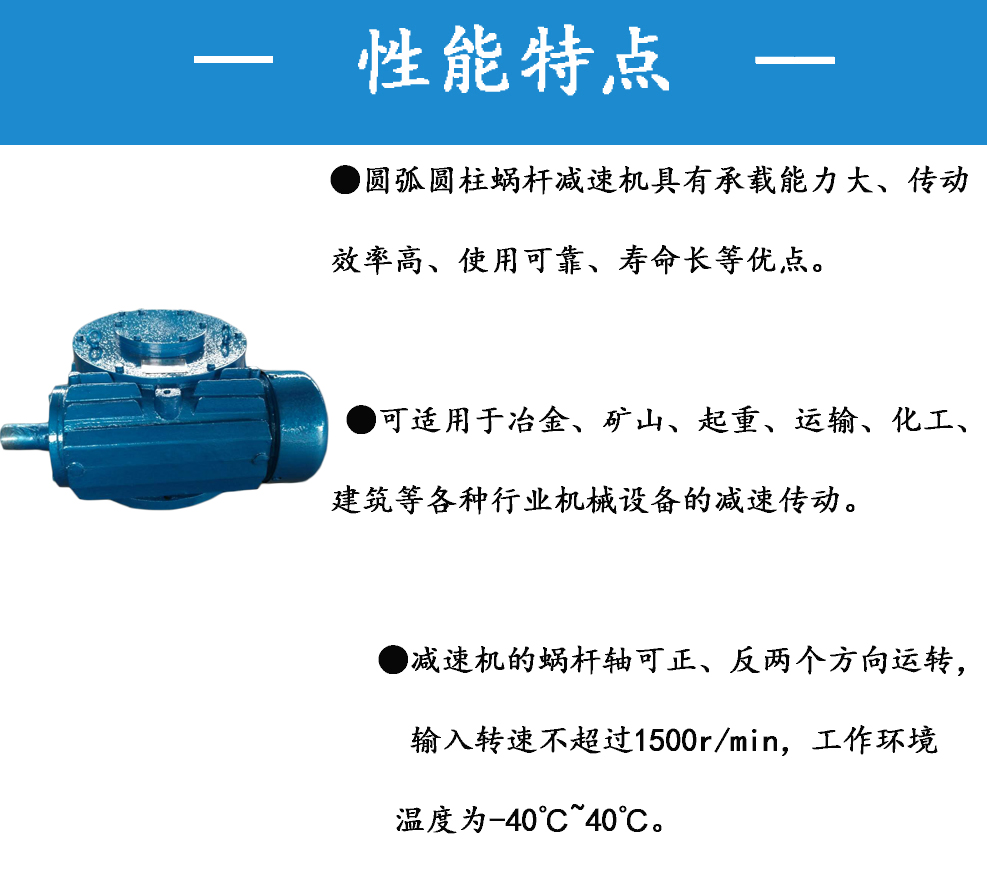 一、概述CW系列圓弧圓柱蝸桿減速器采用單級蝸桿減速傳動,符合行業(yè)推薦性標準JB/T7935-95(原國標GB9147-88),此標準達到國際九十年代水平。全系列共包括三種型號,16種中心距,12種速比。輸入功率范圍在0.39~189kw之間,輸出扭距在07~13500N·m之間圓弧圓柱蝸桿軸可正、反兩個方向運輸,輸入轉速不超過1500r/min,工作環(huán)境溫度為-40~40℃。當工作環(huán)境溫度低于0℃時,起動前潤滑油必須加熱到0C以上;當工作環(huán)境溫度高于40℃時,必須采取冷卻措施。