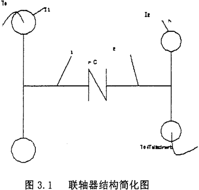 為了便于求解運(yùn)動(dòng)微分方程,需要對(duì)傳動(dòng)軸系中聯(lián)軸器的主動(dòng)和從動(dòng)兩側(cè)的轉(zhuǎn)動(dòng)慣量和剛度作力學(xué)模型的簡(jiǎn)化。根據(jù)具體結(jié)構(gòu)情況,可以將軸系簡(jiǎn)化為若干個(gè)等效轉(zhuǎn)動(dòng)慣量圓盤(pán),以具有某一剛度的周聯(lián)系起來(lái)。通常比較典型的是簡(jiǎn)化為兩個(gè)等效的圓盤(pán),配置在聯(lián)軸器的兩側(cè)。并設(shè)定所聯(lián)兩軸的剛性很大,只有聯(lián)軸器具有彈性和阻尼。如圖3.1所示