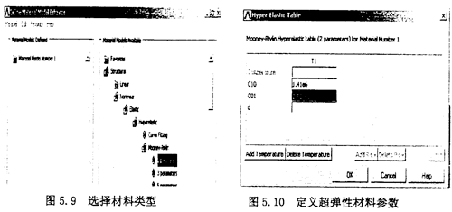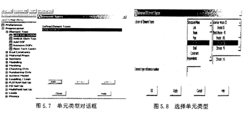 考慮到分析橡膠材料所能用到的單元,選擇Main Menu>Preprocessor>Element type>Add/Edit/Delete,在出現(xiàn)的對(duì)話框中,單擊“Add”,如圖5.7所示。這時(shí)又出現(xiàn)一個(gè)“Library of Element Type”對(duì)話框,在左面的列表欄中選擇“Structural Solid”,在其右面的列表欄中選擇“2Onode186”,單擊0K按鈕,如圖5.8。再在單元對(duì)話框中單擊Close按鈕關(guān)閉對(duì)話框。