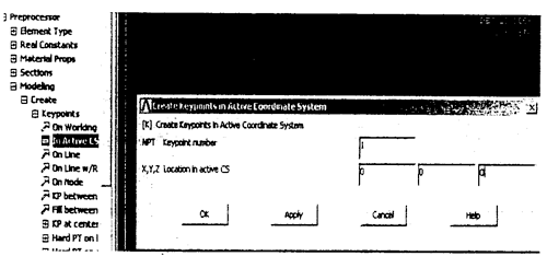 選擇Main Menu>Preprocesor>Modeling>Create>Keypoints>In Active CS,在彈出的對(duì)話框中輸入1關(guān)鍵點(diǎn)的坐標(biāo),如圖5.11所示。單擊“Apply”輸入下一個(gè)點(diǎn)的坐標(biāo)直至所有關(guān)鍵點(diǎn)完全輸入。6個(gè)關(guān)鍵點(diǎn)的坐標(biāo)如表5.1所示。