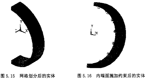 采用影射網(wǎng)格生成單元,Mesh Tool下設(shè)置面上網(wǎng)格尺寸的大小,橡膠圓環(huán)內(nèi)外端面的尺寸設(shè)為30,兩個(gè)截面尺寸設(shè)為5。在“Mesh”工具條下“Shape”下選擇“Hex”“Mapped”,單擊“Mesh”,在圖形屏幕上選擇實(shí)體。單擊“OK”,生成的網(wǎng)格單元如圖5.15所示