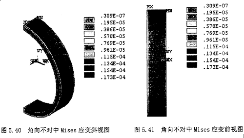 2.顯示節(jié)點的Von Mises應(yīng)力云圖:選擇Main Menu>General Postproc>Plot Result>NodalSolu,在彈出的對話框內(nèi)選擇“Stress”,第二欄內(nèi)選擇“Von Mises Stress”,則其顯示的云圖如圖5,38,5.39所示