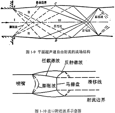 對于圖1-9所示的欠膨脹超聲速自由射流,當射擊流從出口射入靜止大氣中的時候,由于出口截面上的射流的靜壓p1大于環(huán)境壓力pa,在裂尖的邊緣將發(fā)出兩族膨脹波,這兩族膨脹波在中心流線相交,氣體經過膨脹波使靜壓由p1降到pa,經膨脹波后氣流,其自由邊界向外擴張。兩族膨脹波相交之后互相穿過,并保持為膨脹波。這些膨脹波在自由邊界反射回來形成兩族壓縮波,并使氣流邊界向內收縮。這兩族壓縮波相互穿過并在自由邊界上反射回膨脹波,這種波的相交與反射現象不斷地進行下去,逐漸衰減。