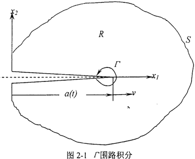 對含運動裂紋的一般彈性體,為確定釋放到裂尖的能量,考慮圍繞裂尖非常小的閉合回路Γ,如圖2-1所示,動態(tài)能量釋放率可以由能量流動定義為: