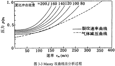 雙曲線法的具體分析過程如圖3-3所示,坐標橫軸表示速度,縱軸表示氣體壓力或環(huán)向應力。上方的一組曲線表征不同韌性水平下的斷裂速度,是內壓或環(huán)向應力的函數(shù)。隨著內壓或環(huán)向應力在斷裂過程中的減小,斷裂速度不斷降低。如果壓力或應力足夠低,斷裂速度即減小到零而發(fā)生止裂。