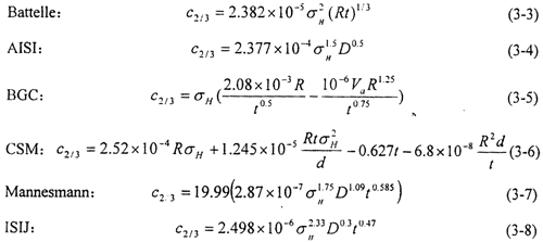 在雙曲線法的基礎上,結合大量的實驗結果對止裂韌性進行標定,世界各大研究機構分別給出了簡便易算的經驗公式用以估算臨界止裂韌性,列舉如下: