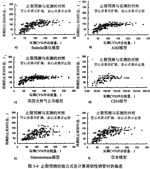 圖3-4表示了Battelle應用Maxey雙曲線法對全尺寸實驗數(shù)據(jù)庫所做的DDF止裂韌性預測,圖3-4a至圖3-4f分別對應于式(3-3)至式(3-8)。圖中顯示的實驗用管的鋼級包括X52到Xl00,管徑范圍從4O6mm到1422mm,實驗最高壓力超過16MPa?梢,預測模型在管材韌性低于某一水平時預測結果與實物實驗結果基本吻合,但當管材韌性較高時出現(xiàn)明顯偏差,預測應該止裂的管線沒有止裂。經典的止裂預測模型在預測夏比能量值高于94J的管材時,已經偏于危險,即過高估計了管材的止裂性能。