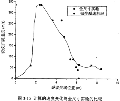 本文通過上述方法,對圖3-9至圖3-12中的全尺寸實測斷裂速度曲線結(jié)果進(jìn)行了校核,得到了比較吻合的結(jié)果。現(xiàn)以聯(lián)盟管道第一次實驗IE段為例,設(shè)定擴(kuò)展的初速度為330m/s,速度變化的計算值同實驗對比如圖3-15所示: