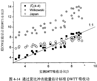 上兩式中Ds表示標(biāo)準(zhǔn)DWTT吸收功相應(yīng)的,ds表示標(biāo)準(zhǔn)DWTT韌性值,即單位面積的DWTT吸收功。CKV和cKV分別表示全尺寸試樣的夏比沖擊功和沖擊韌性值,即單位面積的夏比沖擊功。h為壁厚,mm。