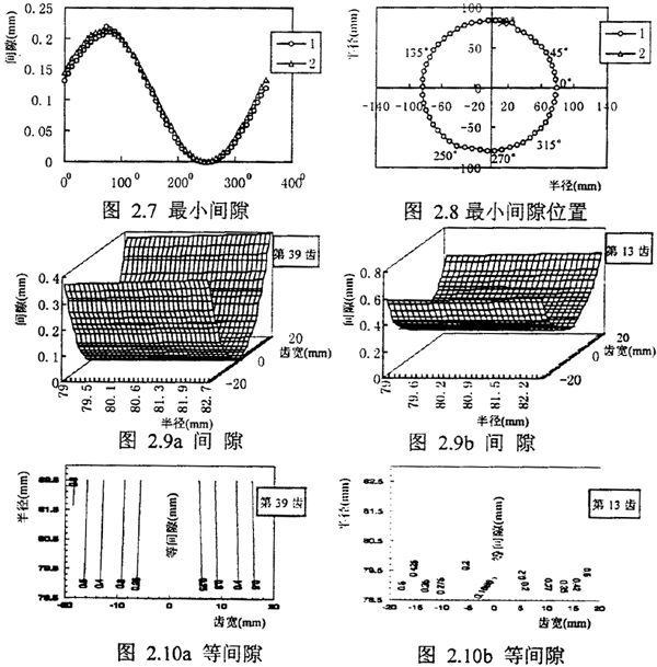 不失一般性設內齒輪為主動輪外齒輪相對內齒輪徑向位移Δx=-0.2mm,Δy=0.無載荷的情況下計算結果:圖2.7是內齒旋轉一周時任意一對齒的最小間隙的變化或在任意的轉角0下各齒對的最小間隙。2.8 圖是半徑方向最小間隙所在的位置,由于外齒是鼓形齒且沒有偏角,在無載荷的情況下只在齒輪的中央齒廓處嚙合所以僅畫出半徑方向最小間隙位置。圖2.7 曲線1 是用本章方法計算的結果,曲線2 是用Heinz 幾何方法計算的結果,我們可以看出用兩種方法計算最小間隙的大小非常一致,但位置不同圖2.8 ,因為Heinz 方法僅規(guī)定內外齒在分度圓上嚙合,本文是從全齒高嚙合狀態(tài)來考慮最小間隙及其位置的。圖2.7中250° 近間隙為零,即在無載荷或輕載荷時內外齒輪在此處附近的對齒嚙合,相應圖2.8 在250°嚙合處的縱坐標大致為基圓的半徑,即嚙合線與基圓相切并與△x 位移線平行,這與前面所說與零齒差齒輪嚙合相似;圖2.9, 2.10 是在θ=0時第39 齒(圖a)和第13齒(圖b)的齒面間隙和等間隙曲線,從圖中可以看出最小間隙在齒寬的中央,這是因內外齒沒有發(fā)生相對轉角位移,而且間隙沿齒高方向間隙變化的梯度小,即分度圓上的間隙與齒高方向的間隙相關很小,而沿著齒輪軸向的間隙變化的梯度較大,等間隙曲線沿軸向分布呈帶狀,這也是Heinz和本文計算最小間隙大小相近的原因。