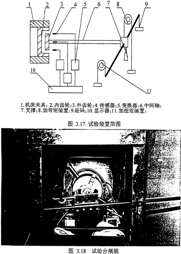 為了驗(yàn)證理論解析結(jié)果,我們?cè)O(shè)計(jì)了如圖所示的試驗(yàn)裝置,取兩個(gè)雙聯(lián)齒輪聯(lián)軸器(一個(gè)外齒輪為直齒,一個(gè)外齒輪為鼓形齒)。對(duì)其進(jìn)行彎曲剛度的測(cè)試。齒輪聯(lián)軸器的內(nèi)齒圈,固定在車床的三爪卡盤上,雙聯(lián)齒輪外齒的一端插入內(nèi)齒圈與內(nèi)齒嚙合,而另一端支承在支點(diǎn)A上,在A端有兩套滑輪杠桿系統(tǒng)如圖3.17,一套是用來給齒輪聯(lián)軸器施加扭矩,另一套是用來給齒輪聯(lián)軸器施加X方向的彎矩。三個(gè)傳感器裝在如圖所示的位置,測(cè)量垂直和水平方向的位移。
