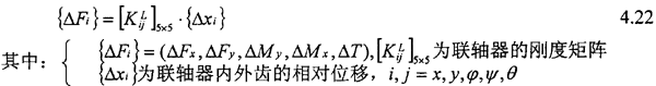 因此通過聯(lián)軸器的剛度[KijL]5×5(由第三章求得)把動態(tài)力和力矩表示成內(nèi)外齒相對位移的顯函數(shù),從而得到齒輪聯(lián)軸器連接軸系的彎曲和扭轉振動方程。