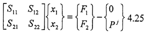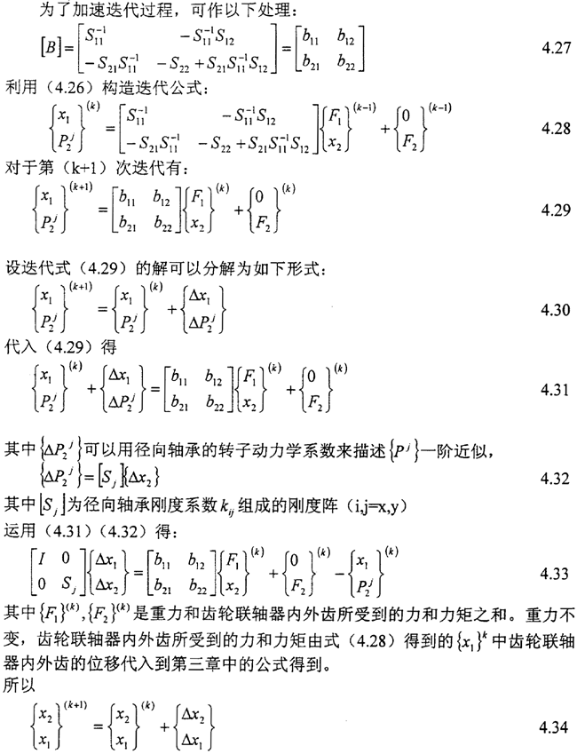 在方程(4.25)中{F1},{F2}為對應于{x1},{x2}的廣義力向量,其中也包括了齒輪聯(lián)軸器內(nèi)外齒所受到的力和力矩。{Pj}則僅由徑向軸承提供的油膜反力組成。當{F1},{F2}和{x2}已知時,可解得{x1},{Pj}。