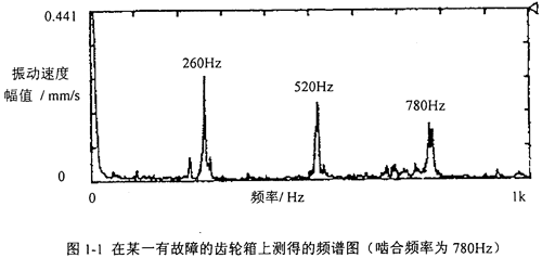 齒輪在傳動(dòng)過程中,輪齒是不斷地處在一齒與兩齒交替咬合狀態(tài),對于斜齒輪,是不斷地處在兩齒與三齒交替咬合狀態(tài)。當(dāng)齒側(cè)有間隙時(shí),此時(shí)的振動(dòng)體系是時(shí)變的非線性系統(tǒng);輪齒間隙過大時(shí)還會(huì)出現(xiàn)瞬時(shí)脫齒狀態(tài)。因此,齒輪所產(chǎn)生的振動(dòng)除了和輪齒嚙合剛度時(shí)變性有關(guān)外,還和齒輪的制造誤差(如質(zhì)量偏心、齒距偏差和齒形誤差)、裝配不良(如兩個(gè)齒輪軸心線不平行)、齒輪正常損傷(如齒輪正常磨損等)和齒輪非正常損傷(如齒面疲勞點(diǎn)蝕、齒面剝落、齒面燒傷、塑性變形和膠合撕傷等)有關(guān)。人們一般都認(rèn)為,齒輪在振動(dòng)時(shí)其振動(dòng)故障頻率為齒輪嚙合頻率的n倍(n=l,2,3,…),但實(shí)際情況并不完全如此,如在圖1-1中,齒輪振動(dòng)故障頻率為齒輪嚙合頻率的1/3、2/3和3/3倍,振動(dòng)速度的幅值也較齒輪正常時(shí)大一些;在另外一些場合,齒輪振動(dòng)故障頻率為n/m倍(n,m皆為正整數(shù))。因此很有必要對產(chǎn)生分?jǐn)?shù)倍亞諧和超諧振動(dòng)的原因作深入的研究工作。
