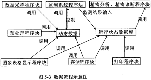 軟件的各個(gè)模塊通過(guò)動(dòng)態(tài)數(shù)據(jù)和運(yùn)行狀態(tài)數(shù)據(jù)庫(kù)聯(lián)系在一起,在下位機(jī)中,監(jiān)測(cè)系統(tǒng)控制著動(dòng)態(tài)數(shù)據(jù)的采集、存儲(chǔ)、顯示和預(yù)處理,同時(shí)把監(jiān)測(cè)結(jié)果存入各機(jī)組運(yùn)行狀態(tài)特征數(shù)據(jù)庫(kù)。在上位機(jī)中,詳細(xì)分析診斷程序塊調(diào)用運(yùn)行狀態(tài)數(shù)據(jù)庫(kù),得出診斷結(jié)果并調(diào)用打印程序塊輸出。圖5-3為數(shù)據(jù)流程示意圖,圖5-4為監(jiān)測(cè)系統(tǒng)流程示意圖。