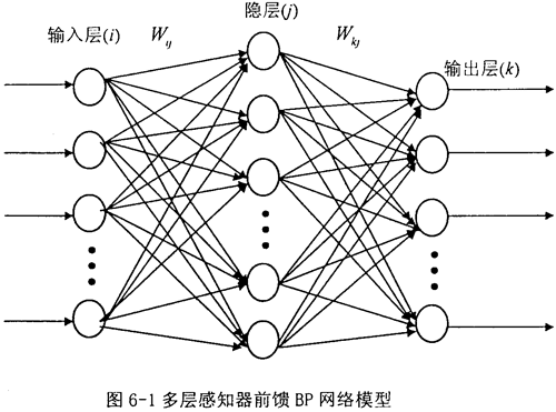 BP算法即是誤差反傳訓練算法,它是一種有導師的訓練算法,它在給定輸出目標的情況下,按其實際輸出與目標值之差的平方和為目標函數(shù),通過調(diào)節(jié)權(quán)值使目標函數(shù)達到最小值。多層感知器前饋BP網(wǎng)絡模型如圖6-1所示。
