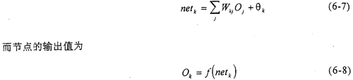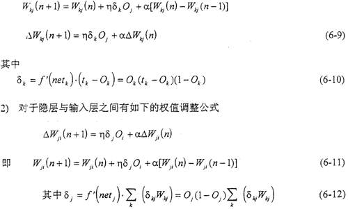 對于圖6-1所示的網(wǎng)絡,其訓練學習的過程包括:1)網(wǎng)絡內(nèi)部的前向計算;2)誤差的反向傳播。其主要目的就是通過逐步調(diào)整網(wǎng)絡的內(nèi)部連接權(quán)值,使網(wǎng)絡的均方誤差達到我們的要求。網(wǎng)絡內(nèi)部的連接權(quán)值的調(diào)整,都是采用推廣的δ規(guī)則來完成的。