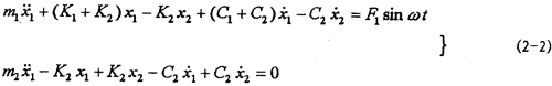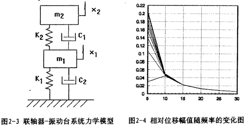 對(duì)應(yīng)的力學(xué)模型如圖2-3(見22頁)所示,式中m1為振動(dòng)臺(tái)動(dòng)圈、聯(lián)軸器外套及固定在振動(dòng)臺(tái)上夾具的質(zhì)量;m2為聯(lián)軸器內(nèi)套、芯軸及配重的質(zhì)量;K1為振動(dòng)臺(tái)支撐動(dòng)圈部分的剛度系數(shù),K2為聯(lián)軸器彈性元件的剛度系數(shù);C1為振動(dòng)臺(tái)動(dòng)圈阻尼系數(shù);C2為聯(lián)軸器