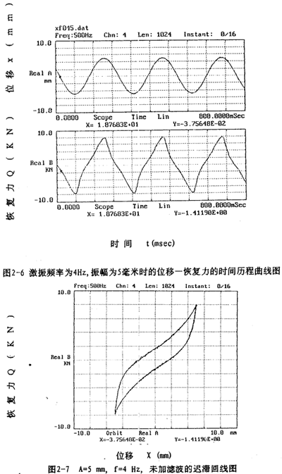 信號(hào)處理時(shí),將磁帶記錄儀記錄的五路振動(dòng)信號(hào)經(jīng)磁帶記錄儀回放,輸出到數(shù)據(jù)采集板(A/D板)進(jìn)行五路振動(dòng)信號(hào)(恢復(fù)力、位移、速度、加速度信號(hào))同步采樣和A/D轉(zhuǎn)換,然后輸出到PC386微機(jī)存人磁盤,該數(shù)據(jù)采集系統(tǒng)采集的數(shù)據(jù)都是以二進(jìn)制形式存儲(chǔ)的文件。為了計(jì)算和閱讀方便,需將二進(jìn)制數(shù)據(jù)文件轉(zhuǎn)換成ASC碼文件,然后再編程進(jìn)行數(shù)據(jù)處理.對(duì)處理后形成的數(shù)據(jù)文件進(jìn)行作圖可以形成許多相應(yīng)的曲線圖,圖2-6至圖2-13是眾多曲線中的一部分。