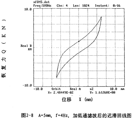 圖2-6表示激振頻率為4Hz,振動(dòng)位移幅值為±5毫米的位移和恢復(fù)力的時(shí)間歷程曲線圖,由圖可知,位移時(shí)間歷程為正弦波形,對(duì)應(yīng)的恢復(fù)力時(shí)間歷程為近似的鋸齒波形。以位移為橫坐標(biāo),恢復(fù)力為縱坐標(biāo),圖2-6對(duì)應(yīng)的位移恢復(fù)力圖為圖2-7,由此圖可知彈性聯(lián)軸器具有非線性遲滯特性。在動(dòng)態(tài)情況下,由于機(jī)座的高頻振動(dòng)和環(huán)境干擾等因素,試驗(yàn)記錄的信號(hào)中有高頻成分存在,這使得遲滯回線不光滑,加低通數(shù)字濾波后可得光滑的遲滯回線,如圖2-8所示。