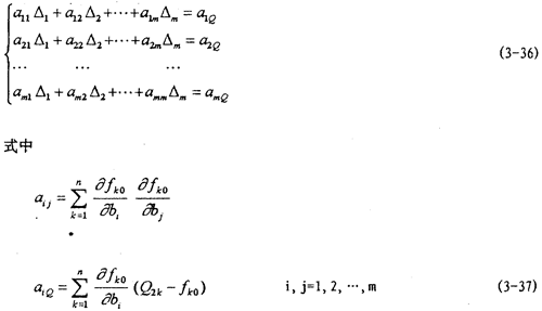 ,并解方程組(3-36)得新的△i,進(jìn)而得bi。這種過程可以重復(fù)進(jìn)行,直至|△t |的值小到給定的精度為止。