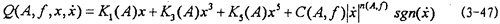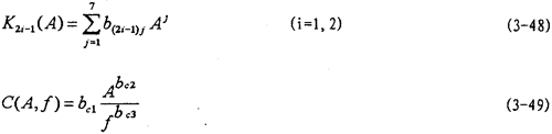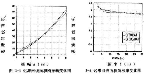 的函數(shù),或者說恢復(fù)力Q是剛度函數(shù)K1(A),K3(A),K5(A)和阻尼函數(shù)C(A,f)以及阻尼成分函數(shù)n(A,f)的函數(shù),其中阻尼成分函數(shù)n(A,f)描述阻尼的組成情況,n(A,f)=0時,阻尼為干摩擦阻尼,n(A,f)=1時,為粘性阻尼,0<n(A,f)<1時,阻尼由粘性阻尼和干摩擦阻尼組成,n(A,f)>1時,阻尼成為“高階”阻尼。對于(3-47)式,當(dāng)振幅與頻率一定時,式中的Kl(A),K3(A),K5(A)和n(A,f)均為定數(shù),當(dāng)振幅A和頻率變化時,它們均是函數(shù),因此參數(shù)辨識實質(zhì)上是參數(shù)函數(shù)的辨識。首先我們用非線性參數(shù)辨識方法Marquardt法,根據(jù)試驗所得的數(shù)據(jù),按照(3-47)式對每一遲滯回線進(jìn)行參數(shù)辨識,可以得到對應(yīng)的K1(A),K3(A),K5(A),C(A,f)和n(A,f)值,對每種工況下的數(shù)據(jù)隨振幅和頻率變化趨勢進(jìn)行分析后,可以建立剛度函數(shù)、阻尼函數(shù)和阻尼成份函數(shù)的數(shù)學(xué)表達(dá)式為: