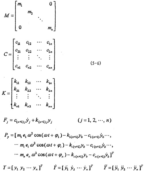當(dāng)主機(jī)以角速度ω轉(zhuǎn)動(dòng)時(shí),軸系在各偏心力的作用下產(chǎn)生穩(wěn)態(tài)振動(dòng),其運(yùn)動(dòng)微分方程可表示為: