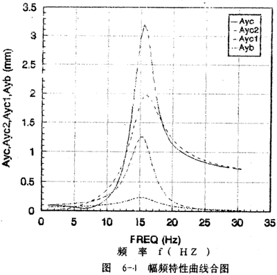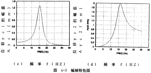 yc2的幅頻特性如圖6-2(d)所示。Ayc2從1赫茲開始隨頻率的增大而迅速增大,在軸系的二階固有頻率15.56赫茲處達到最大值,然后隨頻率增大而減小并趨于某一定值,Ayc2隨頻率變化的規(guī)律反映圓盤僅在質(zhì)量偏心激勵下,而軸系沒有鋼絲繩聯(lián)軸器影響時圓盤的幅頻特性?紤]上聯(lián)軸器對圓盤幅頻特性的影響部分Ayc1(圖6-2(c)所示部分),則圓盤的幅頻特性即為圖6-2(a)所示。由此可見,鋼絲繩聯(lián)軸器在頻率的較低段(0~11赫茲)對圓盤振動有抑制作用。值得一提的是Ayc不是Ayc1和Ayc2的簡單相加,而與各頻率對應(yīng)的向量{a}中17個元素以及相位有關(guān)。