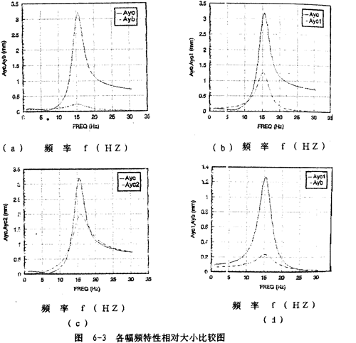 圖6-3(b)表示圓盤振幅Ayc(實線)與聯(lián)軸器引起的圓盤振幅分量Ayc1(虛線)的相對大小比較圖。圖6-3(c)表示圓盤振幅Ayc(實線)與圓盤質(zhì)量偏心引起的圓盤振幅分量Ayc2(虛線)的相對大小比較圖。圖6-3(d)展示了聯(lián)軸器引起的圓盤振幅分量Ayc1(實線)與聯(lián)軸器振幅Ayb(虛線)的比較圖。從圖6-3(b)、(c)可知,圓盤偏心質(zhì)量引起的圓盤振動位移分量yc2的幅值A(chǔ)yc2(虛線)大于聯(lián)軸器引起的圓盤振動位移分量yc1的幅值A(chǔ)yc1(虛線)。從這兩圖中曲線的比較還可以知道,鋼絲繩聯(lián)軸器對圓盤振幅的影響在不同頻率段效果是不相同的?偟膩碚f,在頻率12.7~18.3赫茲區(qū)域外,聯(lián)軸器對圓盤振動是起減振作用的,這一特性可以從圖6-13(c)清楚地看到。但在此頻率范圍內(nèi),聯(lián)軸器對圓盤振動是增大作用的。