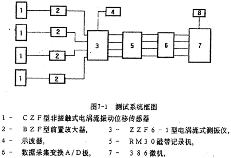 如圖6-l所示,實驗臺安裝在一個4噸重的鋼質(zhì)平臺上,兩個球面球軸承支座1支承一根直徑為30毫米,長度為1500毫米的等直徑軸3,兩軸承座中間的軸上裝有一個直徑為300毫米,厚度為50毫米的圓盤2,軸的外伸端與調(diào)速電動機(jī)5之間有鋼絲繩聯(lián)軸器4相聯(lián)。在圓盤外緣以及在聯(lián)軸器從動端(內(nèi)套)與軸外伸端聯(lián)結(jié)處的水平和垂直方向各安裝一個非接觸式電渦流振動位移傳感器6。測試系統(tǒng)框圖如圖7-1所示。