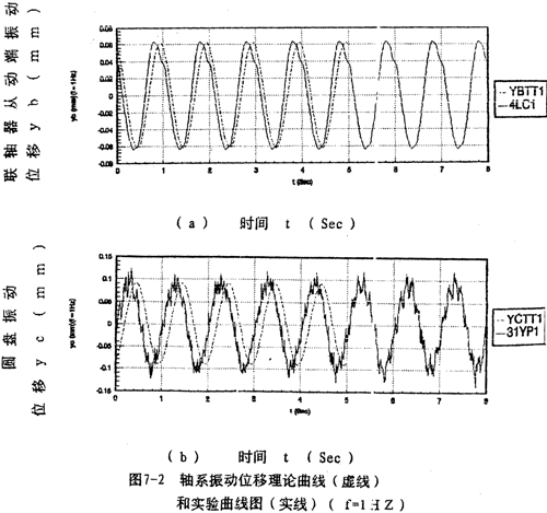 測量數(shù)據(jù)進(jìn)行分析處理后,結(jié)果如圖7-2~圖7-5所示。圖7-2(a)~(b)和圖7-3(a)~(b)分別給出調(diào)速頻率為1。2赫茲時圓盤和聯(lián)軸器從動端y方向的振動位移時域曲線,圖7-4、圖7-5分別給出聯(lián)軸器從動端、圓盤y方向的振動位移的理論和實驗幅頻曲線圖(實線為理論曲線,圓點線為實驗曲線),總的來看,理論與實驗結(jié)果較好地重合。然而,在某些頻率點處,振動位移幅值的理論計算與實驗結(jié)果相差值,雖然絕對值差異并不大,但從相對值來講,差異較大,這是由于軸系還受到諸多因素,如軸承座、軸承、電動機(jī)等振動的相互影響;當(dāng)然,測試儀器,數(shù)據(jù)處理都有可能產(chǎn)生誤差。由圖7-2、7-3還可以看到,理論計算與實驗所得的振動位移時域曲線之間存在著相位差,這是因為采集數(shù)據(jù)時,時域曲線的相位不能保證與理論計算相位一致造成的,但這不影響兩者的本質(zhì)特性