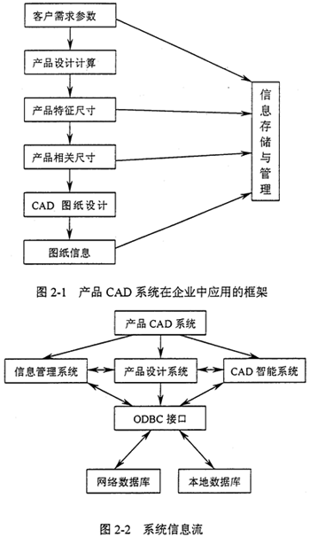 從企業(yè)的角度來說,利用計算機技術,將企業(yè)的產(chǎn)品設計流程與企業(yè)管理有效地結合起來(圖2-l),實現(xiàn)企業(yè)管理與產(chǎn)品設計一體化。從系統(tǒng)實現(xiàn)的角度來說,是將CAD系統(tǒng)、信息管理系統(tǒng)和工程數(shù)據(jù)庫在網(wǎng)絡上的結合,見圖2-2,產(chǎn)品CAD系統(tǒng)包括產(chǎn)品信息管理系統(tǒng)和CAD的二次開發(fā)系統(tǒng),特點突出: